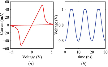 Fig. 1. Simulated circuit properties of high-frequency voltage-driven memristive system. (a) I-V hysteresis shape. (b) Normalized state variable curve.