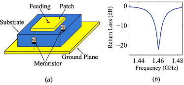 Fig. 2. (a) Schematic of dual memristors embedding in an L-band directly modulated patch antenna. (b) Reflection coefficient for microwave patch antenna without the modulation.
